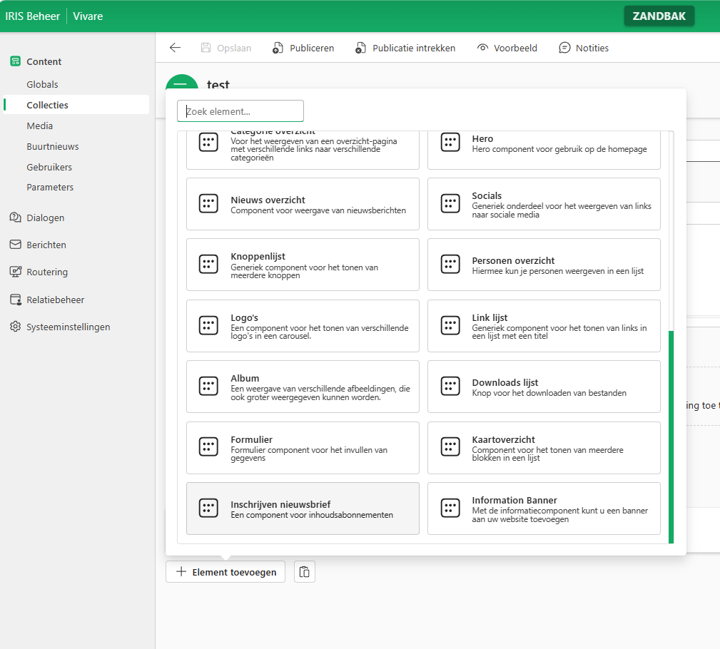 Maak eerst een testpagina aan voor het testen van de nieuwsbrief en voeg het nieuwe element Inschrijven nieuwsbrief toe.